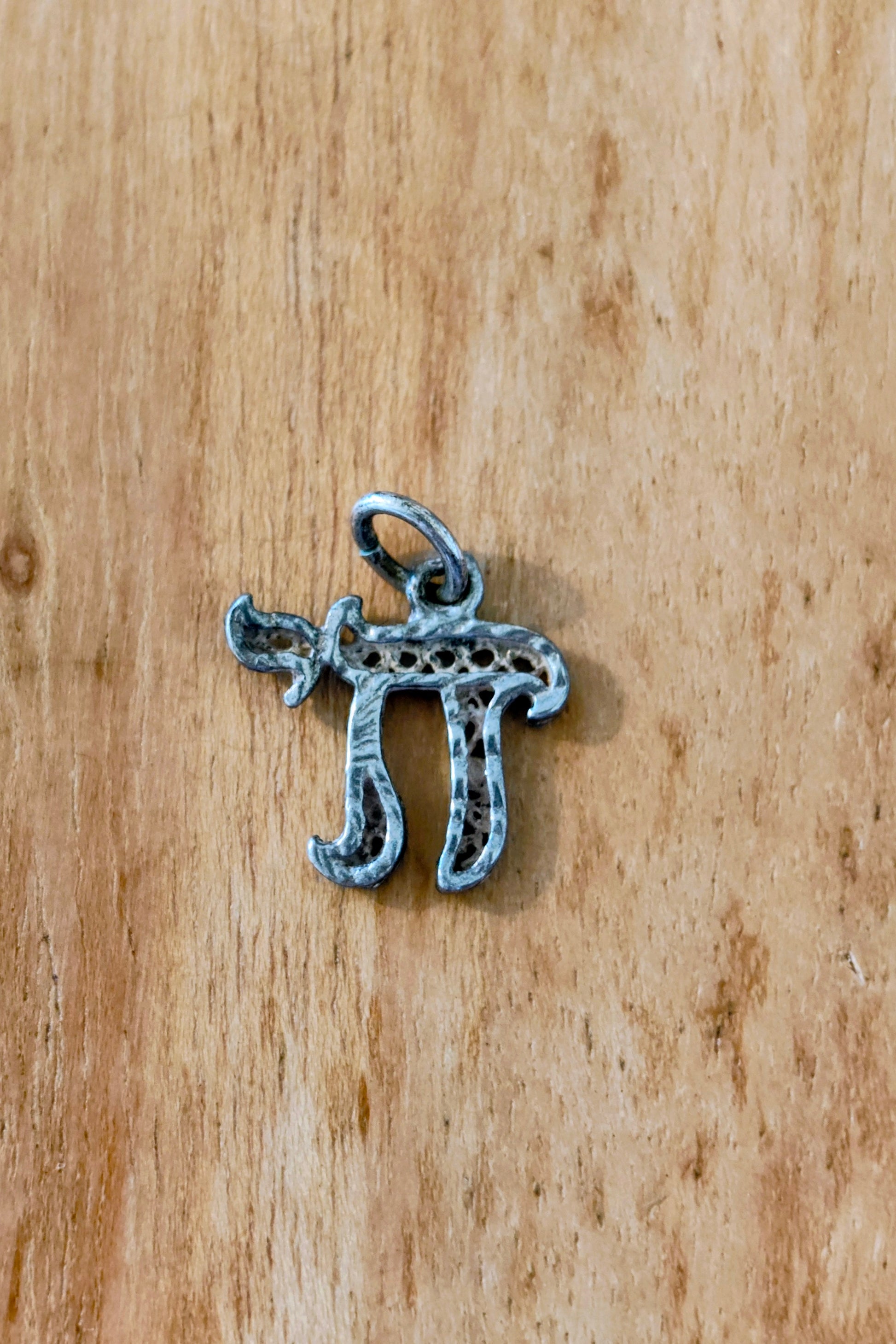 Dieser elegante Chai-Anhänger ist ein handgearbeitetes Vintage-Stück aus dem 20. Jahrhundert und stammt aus einer privaten Sammlung. Gefertigt aus Silber, stellt er das hebräische Wort für das Leben dar. Die ziselierte Oberflächenstruktur sorgt für lebendige Lichtreflexe und macht dieses