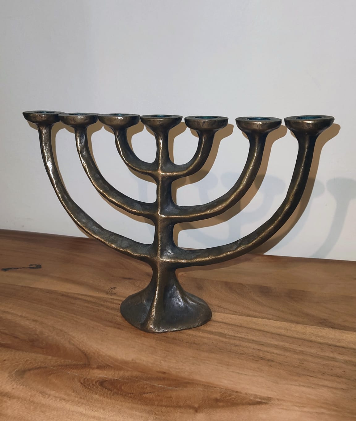 Diese Menora mit dem Namen Emet (die Wahrheit) besticht durch ihre skulpturale, kraftvolle Form im Stil des Modernismus. Sie ist vermutlich aus massiver Bronze/Messing gefertigt und wiegt beeindruckende 2,6 kg.