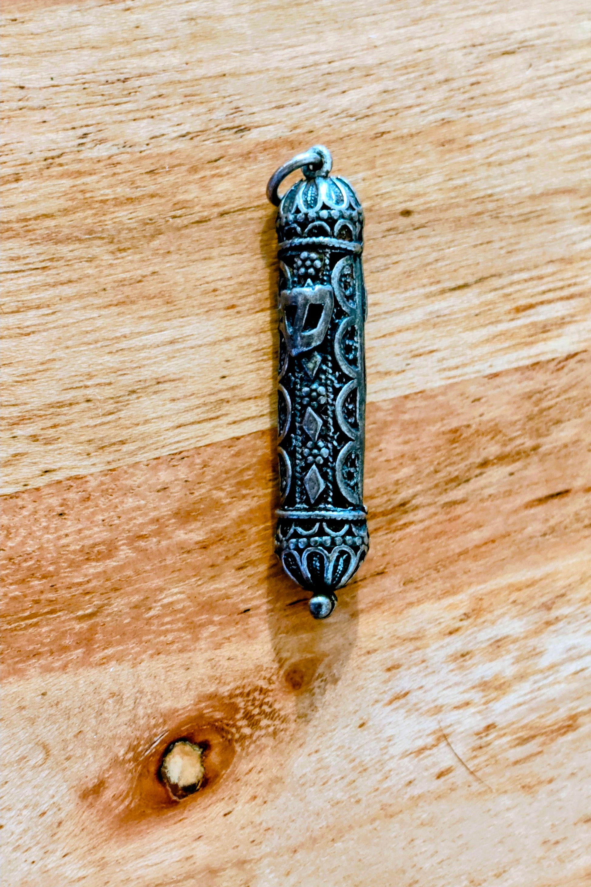 Dieser filigrane Mesusa-Anhänger ist ein authentisches Vintage-Stück aus dem 20. Jahrhundert und wurde aus einer privaten Kollektion übernommen. Er ist vollständig aus Silber gefertigt und zeigt eine lückenlose, handgearbeitete Ornamentik in Zylinderform.