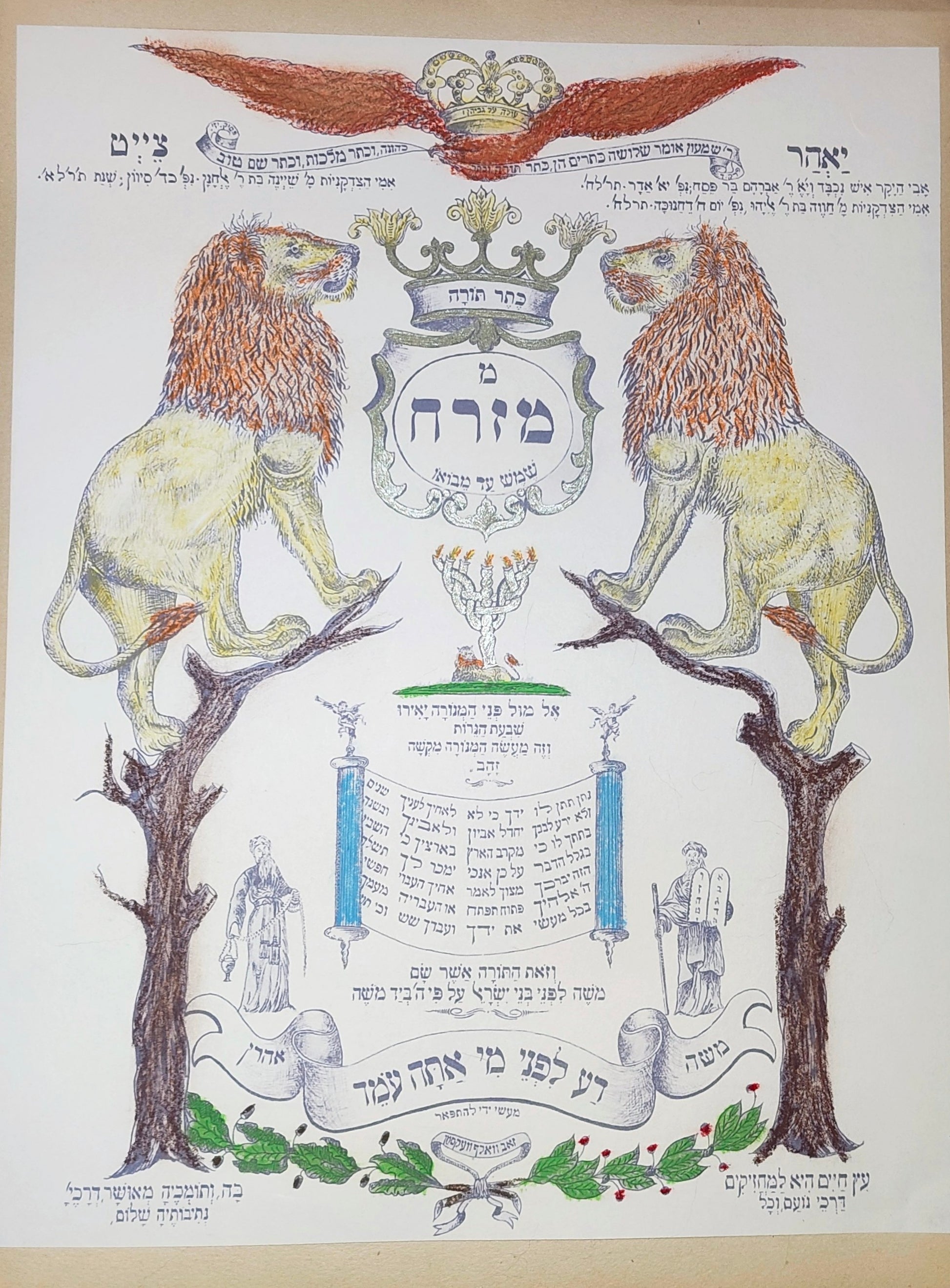 Dieser Mizrach (hebräisch für „Osten“) dient traditionell dazu, im Haus die Gebetsrichtung nach Jerusalem anzuzeigen. Er ist reich an Symbolik: Die Löwen von Juda stehen für Stärke, während Moses und Aaron das Zentrum flankieren. Ein besonderes Detail ist der Psalm 67, der kunstvoll in Form einer siebenarmigen Menora geschrieben steht.