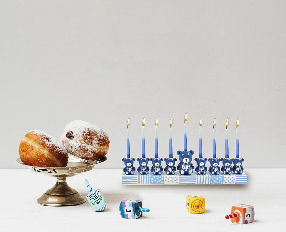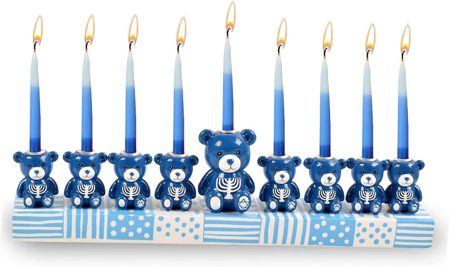 Jeder der niedlichen blauen Bären hält stolz ein Licht und symbolisiert die Freude und Wärme der Chanukka-Tradition. Mit ihrem verspielten Look ist diese Chanukkia nicht nur ein wunderschönes Ritualobjekt, sondern auch eine charmante Dekoration für jedes Zuhause.