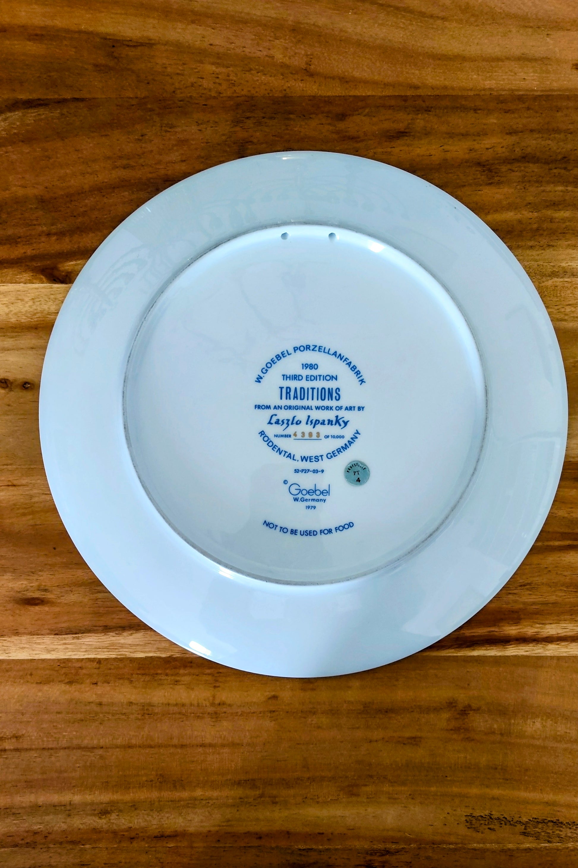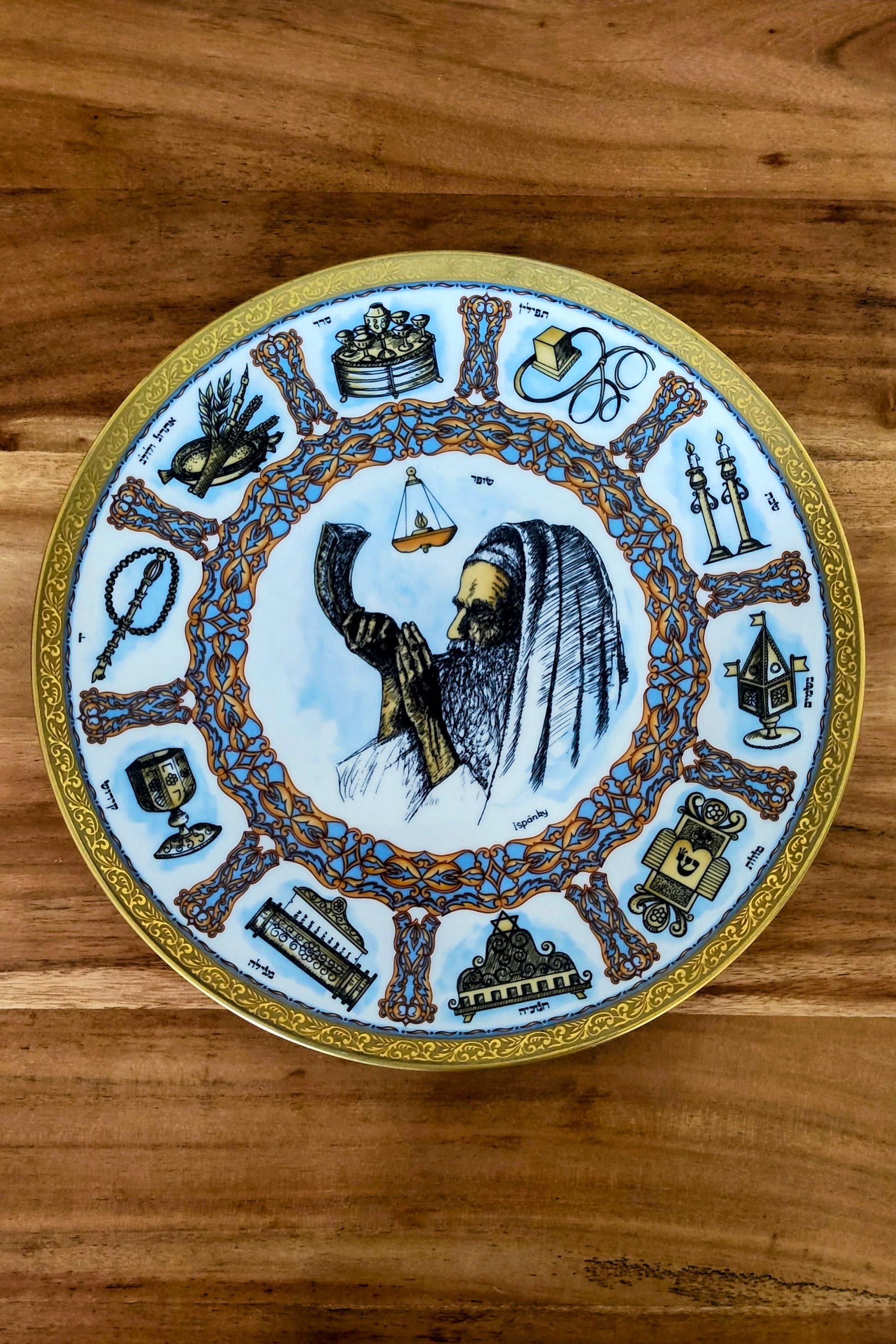 Dieser imposante Teller mit einem Durchmesser von 30 cm ist ein außergewöhnliches Zeugnis jüdischer Zeitgeschichte im Porzellandesign. Er gehört zu einer exklusiven Serie der Manufaktur Goebel, die im Jahr 1980 ganz gezielt den jüdischen Traditionen gewidmet war.