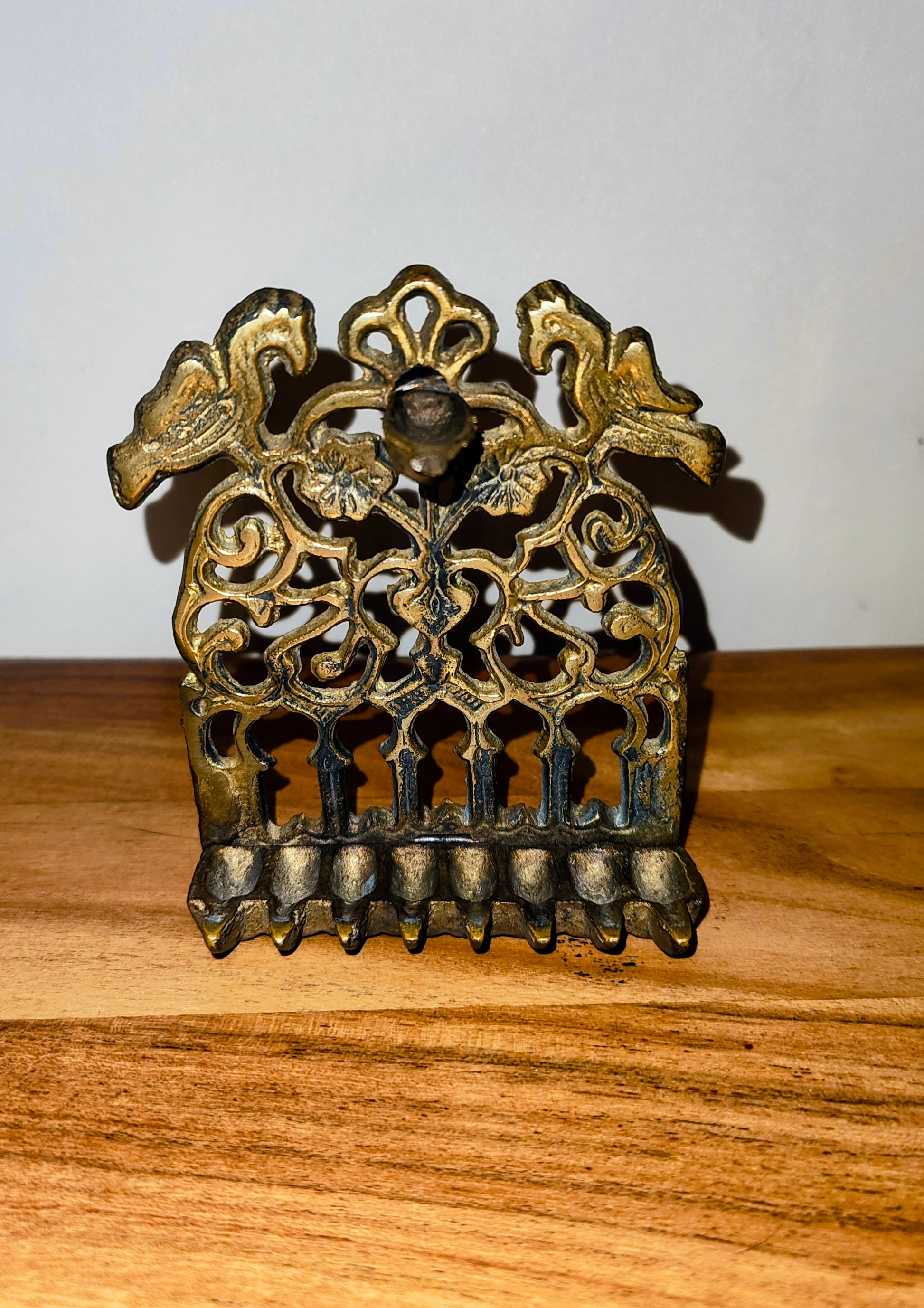 Das ist Zippora (hebräisch für „Vogel“). Sie ist weit mehr als nur ein schönes Objekt – sie ist eine sehr alte und wertvolle Öl-Chanukkia aus Bronze in traditioneller sephardischer Form.